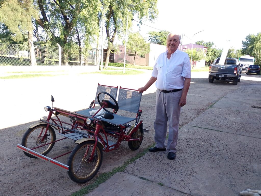En la tarde de este día 6 de Marzo 2024, encontramos estacionado en » Corralón Las Malvinas » al minititi propulsado a batería. Sorprendidos por este medio de movilidad, aguardamos a su conductor y al cabo de unos minutos salió del citado comercio el señor DUJE KOLUDROBICH, vecino de esta ciudad, a quien interrogamos al respecto y nos contó que el vehículo tiene todas las características de un auto común y que al mismo lo utiliza para hacer mandados.