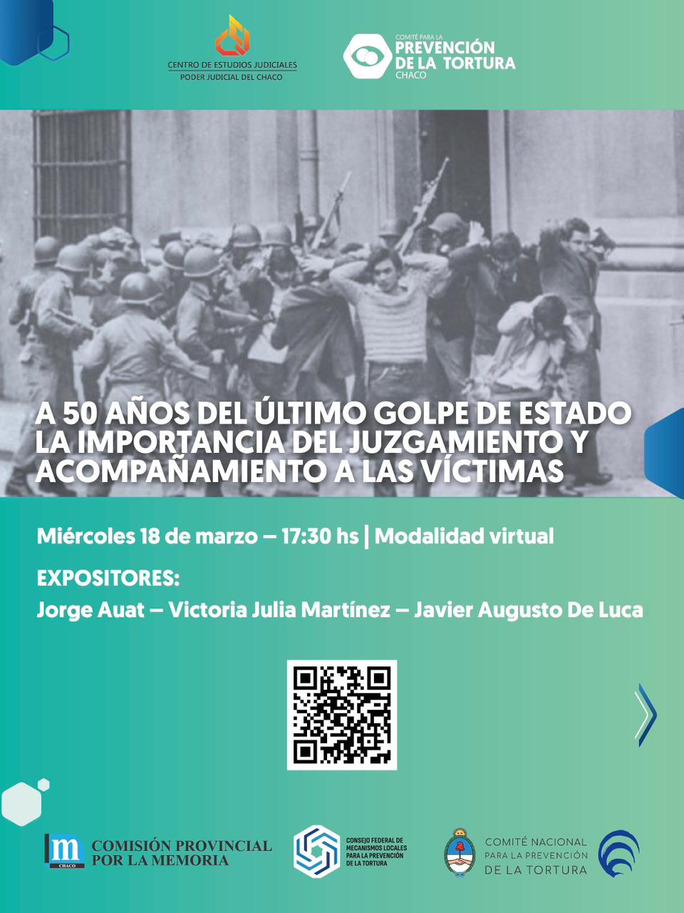 El Comité para la Prevención de la Tortura, con la colaboración del Centro de Estudios Judiciales, realizará el próximo miércoles 18 de marzo a las 17:30 horas el panel titulado “A 50 años del último golpe de Estado – La importancia del juzgamiento y el acompañamiento a las víctimas”.