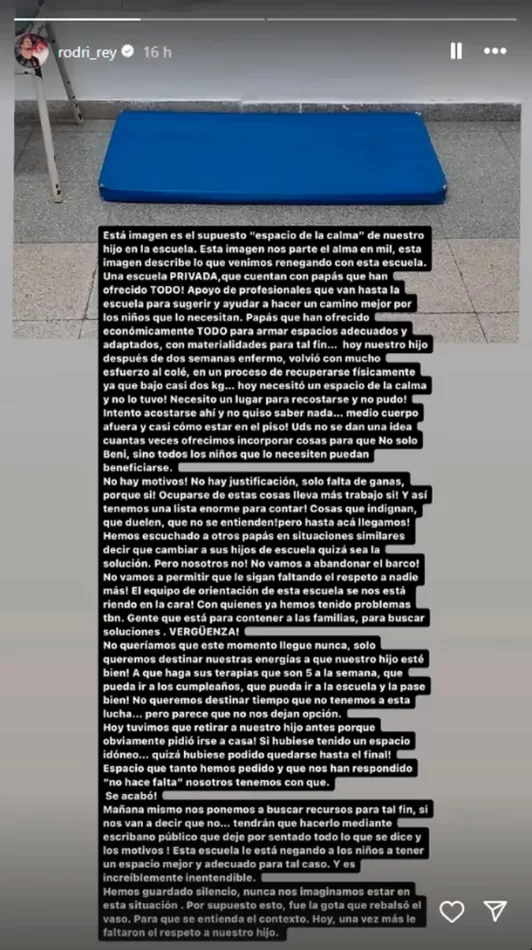 “Hoy nuestro hijo, después de dos semanas enfermo, volvió con mucho esfuerzo al colegio, en un proceso de recuperarse físicamente, ya casi bajó dos kilos. Hoy necesitó un espacio de calma y ¡no lo tuvo! Intentó acostarse ahí y no quiso saber nada. Medio cuerpo afuera y casi como ¡estar en el piso! Ustedes no se dan una idea cuántas veces ofrecimos incorporar cosas no solo para Beni, sino para todos los niños que necesiten y puedan beneficiarse”, describió.