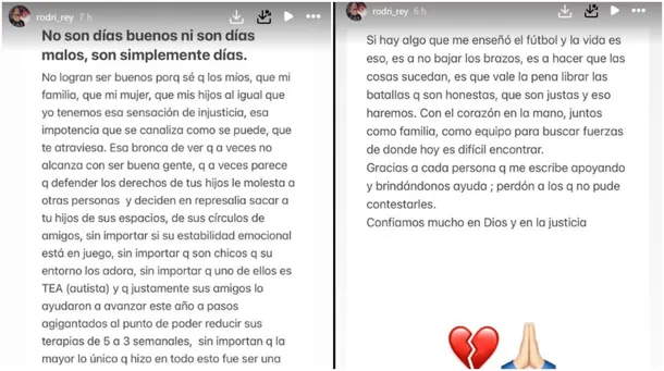 “Esa bronca de ver que a veces no alcanza con ser buena gente, que defender los derechos de tus hijos le molesta a otras personas y deciden, en represalia sacar a tus hijos de sus espacios, de sus círculos de amigos, sin importar si su estabilidad emocional está en juego, sin importar que son chicos que su entorno los adora, sin importar que uno de ellos es TEA (autista) y que justamente sus amigos lo ayudaron a avanzar este año a pasos agigantados al punto de poder reducir sus terapias de 5 a 3 semanales. ESTAMOS ROTOS”, indicó Rodrigo Rey en sus redes sociales.