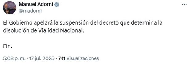 EL GOBIERNO APELARÁ AL FALLO QUE SUSPENDE LA DISOLUCIÓN DE VIALIDAD NACIONAL