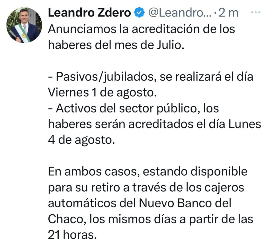 Este jueves, el gobernador Leandro Zdero informó que los haberes correspondientes al mes de julio estarán depositados de acuerdo al siguiente cronograma: