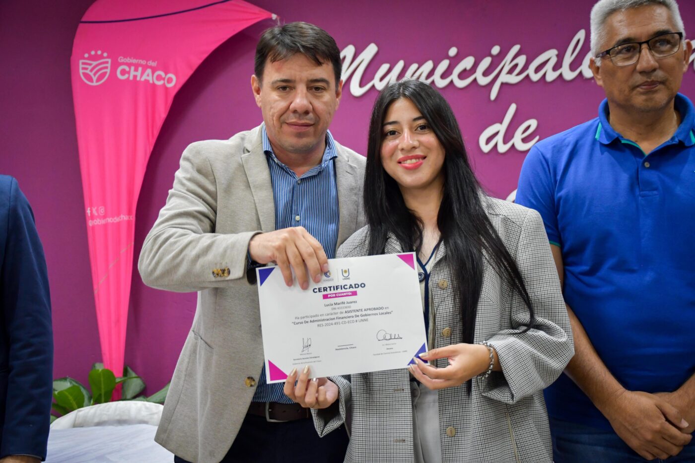 Este viernes, por la mañana, el Secretario de Asuntos Estratégicos, Marcos Resico junto al al Lic. Patricio González, Secretario Gral. de Extensión Universitaria UNNE; al Magister Celestino Fantin, Vicedecano de la Facultad de Ciencias Económicas; al subsecretario de municipio, Marcelo Barrios y al Lic. Federico Martos, Sec. de Extensión y Ejercicio Profesional de la Facultad de Ciencias Económicas, entregaron en Concepción del Bermejo, los certificados correspondientes a la Capacitación de Gestión y Administración de los Gobiernos locales destinado a personal de los municipios. La bienvenida, estuvo a cargo del intendente local, Raúl Maldonado acompañado por otros intendentes de la región y la secretaria de gobierno de Los Frentones. “Para nosotros siempre es un privilegio estar cerca de la UNNE, somos hijos de esta Casa de Estudios, hemos pasado muchos años y también formamos parte de ese equipo de trabajo. La Universidad tiene mucho para darle a nuestra provincia, a nuestros pueblos, junto a sus autoridades por eso acercamos esta capacitación dirigida al personal municipal para ir mejorando los recursos humanos y llegar a muchos objetivos trazados. Hoy estamos muy contentos por esta articulación y porque hay más de 260 graduados en esta región, y así, damos por finalizado este ciclo”- manifestó el secretario de Asuntos Estratégicos, Marcos Resico, junto al subsecretario de municipio, Marcelo Barrios.