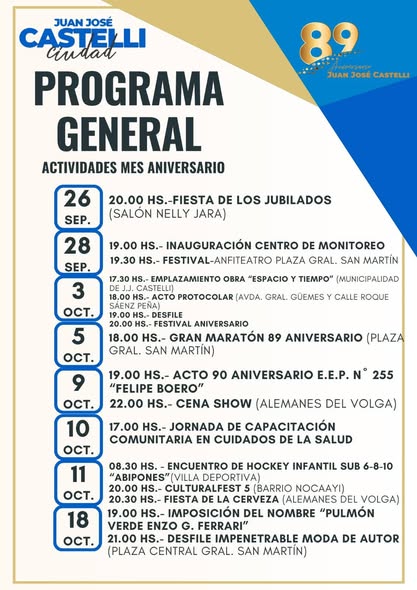 El mes continuará con el Gran Maratón 89° Aniversario (5 de octubre), el acto por los 90 años de la E.E.P. N° 255 “Felipe Boero” y una cena show (9 de octubre), además Encuentro de Hockey Infantil Sub 6-8-10 “Abipones” (Villa Deportiva).