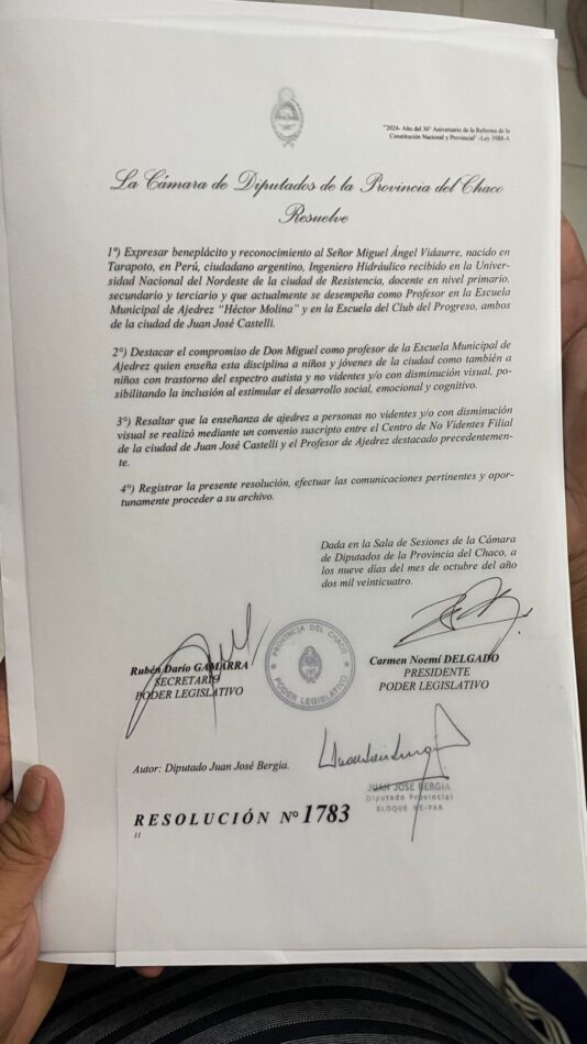 Expresar beneplácito y reconocimiento al Señor Miguel Ángel Vidaurre, nacido en Tarapoto, en Perú, ciudadano argentino, Ingeniero Hidráulico recibido en la Universidad Nacional del Nordeste de la ciudad de Resistencia, docente en nivel primario, secundario y terciario y que actualmente se desempeña como Profesor en la Escuela Municipal de Ajedrez «Héctor Molina» y en la Escuela del Club del Progreso, ambos de la ciudad de Juan José Castelli.