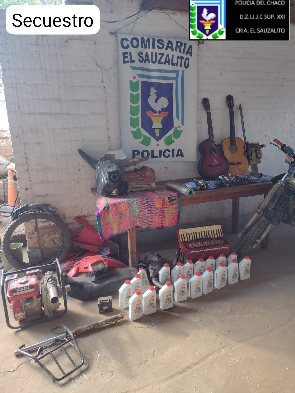 Dinero en efectivo: trescientos cincuenta y tres mil pesos (353.000$) discriminados billetes diferente valores. (14) Armas blancas (13) rollos alambre liso 1.000 mts , varias partes de motocicleta HONDA TORNADO 250 CC, c/rojo, (desarmada (01) autobomba marca sensei (10) cámaras nuevas p/ motocicletas.(02) guitarras tipo criolla (01) acordeón marca TELEFUNKER (03) Jergones (19) botellas aceite marca Castrol 1 lt. P/motocicletas. Elementos secuestrado de forma impostergable por no poder acreditar la propiedad y se procedió a la Aprehensión ciudadano con iniciales A G (criollo) 28 años, jornalero, ddo. Bajo Verde –de la localidad del SAUZALITO (PRESUNTO AUTOR DE LA CAUSA INVESTIGADA.