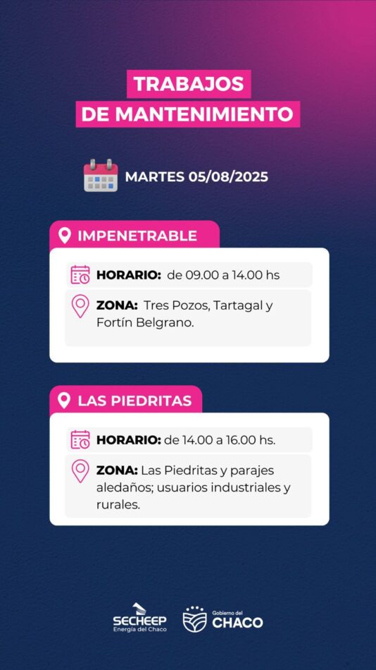 La empresa Secheep informó que este martes 5 de agosto realizará trabajos programados de mantenimiento en distintos puntos de la provincia.