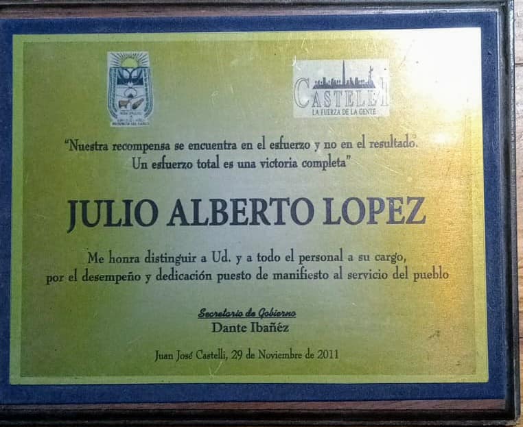 Papito, hoy después de estar 39 años al servicio de la gente, te vas por la puerta grande, dejando un pedacito de tu vida en cada una de las personas que ayudaste, y en cada acción que hiciste por mejorar tu amado Castelli.