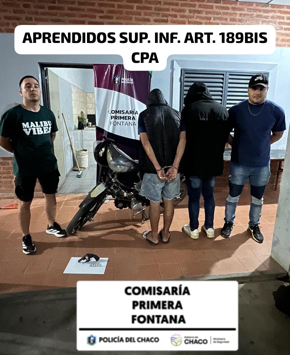 Durante la madrugada de este sábado, personal de la Comisaría Primera de Fontana detuvo a dos hombres que circulaban en motocicleta con un arma de fuego, en un procedimiento realizado sobre la avenida 25 de Mayo y calle Sarmiento.