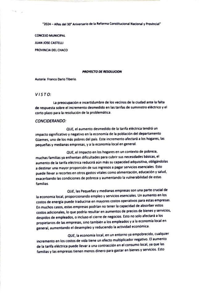 En la última sesión del Concejo Deliberante de la Municipalidad de Juan José Castelli, el concejal del Bloque Chaco Crece, perteneciente al Partido Justicialista, Franco Tiberio, presentó un proyecto de su autoría destinado a abordar la preocupante escalada en las tarifas del servicio de suministro eléctrico.
