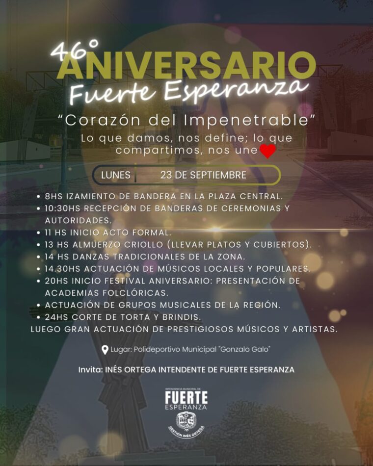 La intendente Inés Ortega, expresó su entusiasmo por el aniversario: «Fuerte Esperanza ha crecido y se ha transformado a lo largo de estos 46 años. Este festejo no solo es una ocasión para celebrar nuestro pasado, sino también para mirar hacia el futuro con esperanza y unidad.»