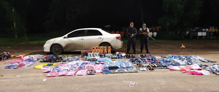 En la madrugada de hoy, a la demora de (01) automóvil TOYOTA Corolla conducido por M. R.O de 43 Años domiciliado en Pcia. Roque Sáenz Peña a quien se solicita exhibiera interior del baúl, constatando en el interior del mismo mercadería varia (ropas, mochilas, zapatillas, etc.), por lo que al solicitar exhiba documentación de la misma adujo no poseer, tratándose de: