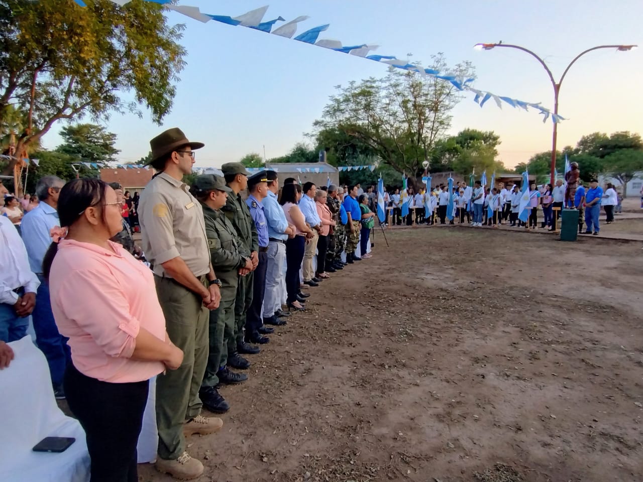 A las 18 hs., se inició el homenaje con el canto del Himno Argentino, la Marcha de Malvinas y la emotiva canción del Chaco, seguido por el simbólico gesto de arrió de la bandera. Luego, en un gesto de profundo respeto, el Intendente Rafael FRIAS junto a Ricardo Ramirez hicieron entrega de una corona de flores al monumento del soldado caído en Malvinas, Celso Páez, acompañados por familiares del fallecido Excombatiente Campos Alejandro. Se prosiguió con la bendición del pastor Marcelo Escobar de la Iglesia Unida y del Cura Párroco de la localidad.