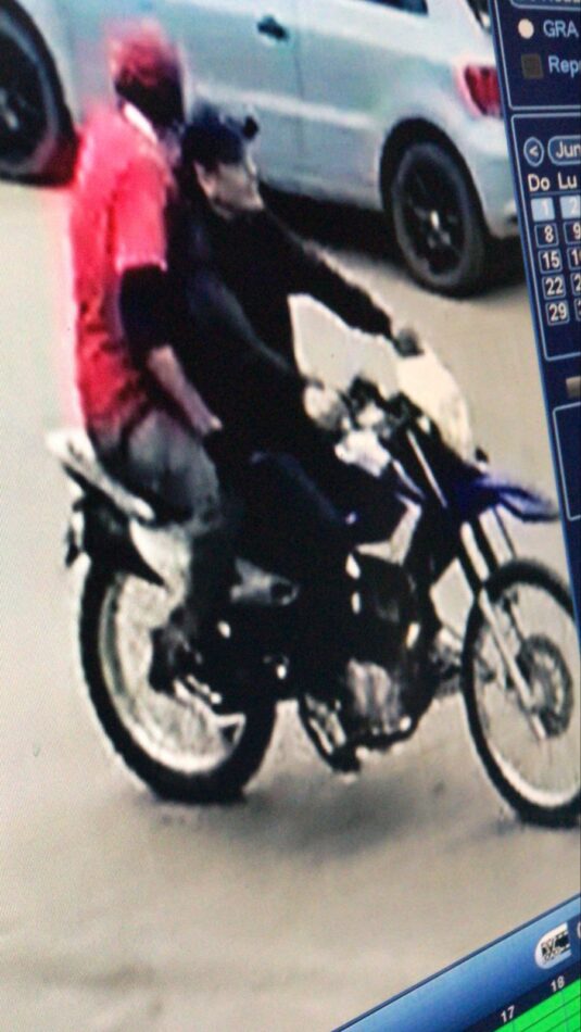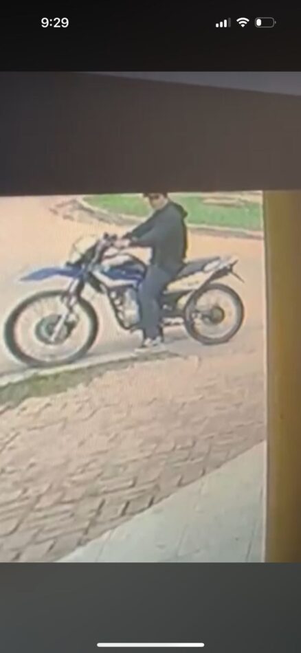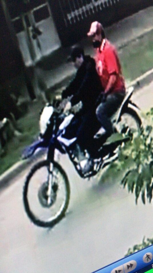 Las cámaras de seguridad del local registraron a los presuntos autores del robo: dos hombres que se movilizaban en una motocicleta blanca y azul de 125 cc. El acompañante, de contextura robusta y tez morocha, vestía una remera roja con la palabra “California”, gorra bicolor y barbijo. Fue quien ingresó al local. El conductor, de contextura delgada y también moreno, vestía ropa oscura y se mantuvo en el exterior como vigía.