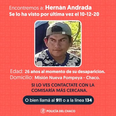 En caso de tener información del paradero, comunicarse a la comisaría más cercana o bien llamar al 911 o 3624605811 de la Comisaria Misión Nueva Pompeya.
