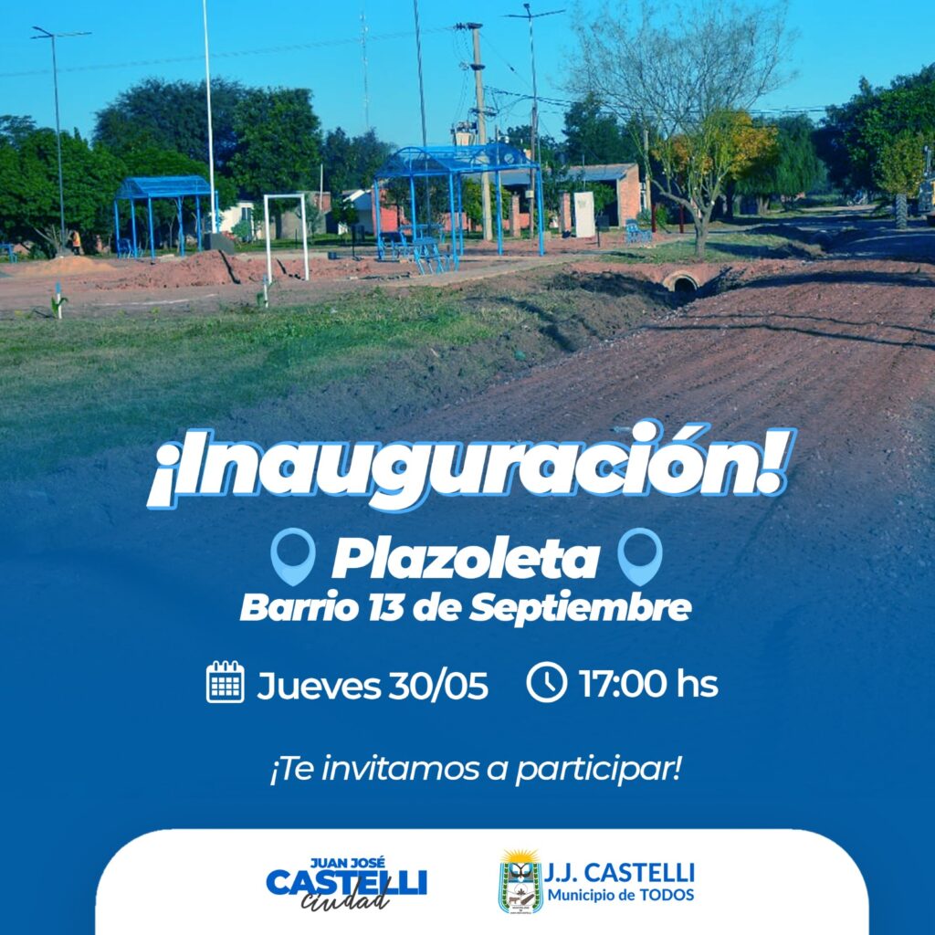 El municipio invita a toda la comunidad a asistir a la inauguración de la Plazoleta 13 de Septiembre este jueves 30 de mayo a partir de las 17:00 horas. La celebración sera inolvidable y contará con chocolate caliente para los asistentes.