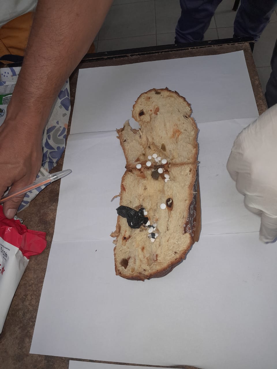 Los agentes comenzaron la inspección de rutina, el llavero de turno constató que en el interior de un pan dulce se ocultaban 30 pastillas de origen desconocido y cinco bochitas de polietileno transparente color celeste, que contenían 0,7 gramos de clorhidrato de cocaína.