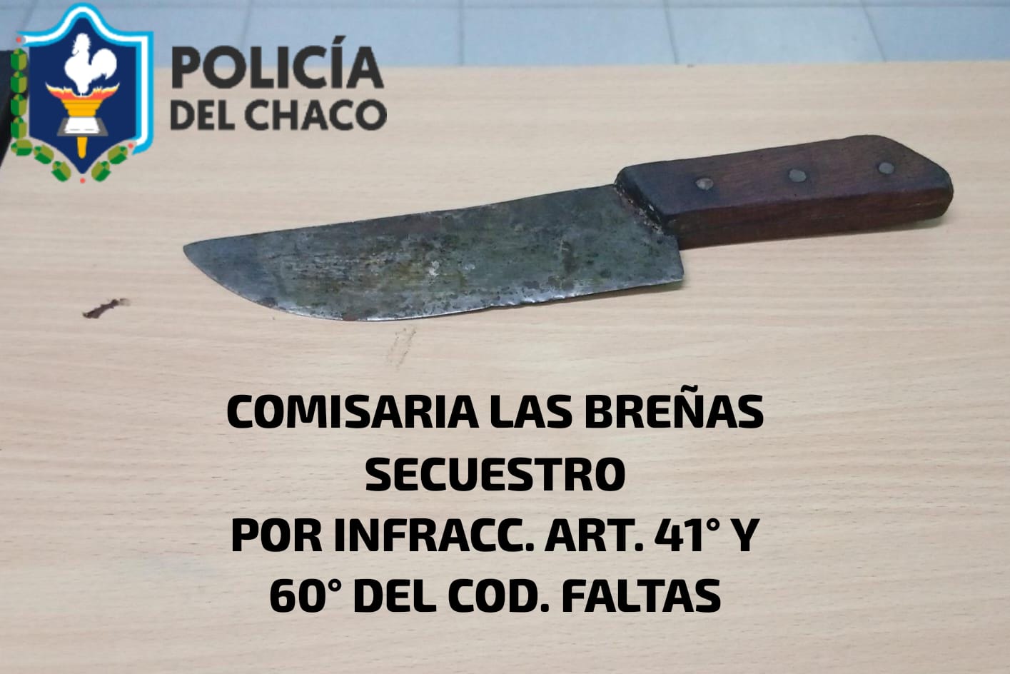 Efectivos de la Comisaría Las Breñas, en el marco del Operativo de Seguridad Preventiva “Patrullaje Motorizado Lince”, demoraron a un hombre que ocasionaba disturbios en la vía pública portando un arma blanca.