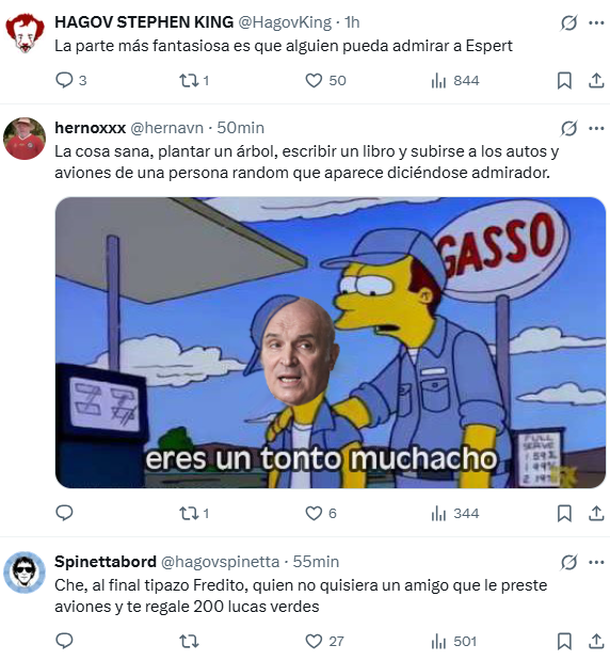 También durante la entrevista con Anello, Espert respondió «llorando» al ser preguntado sobre cómo se sentía tras el escándalo que hizo peligrar su candidatura: «Yo tengo hijos, tengo hermanos, una esposa, y esta basura ha hecho lo que ha hecho con mi nombre, el de mi padre, la verdad, terrible, terrible», indicó, en relación a Juan Grabois, que fue el encargado de sacar a la luz el vínculo narco del legislador.