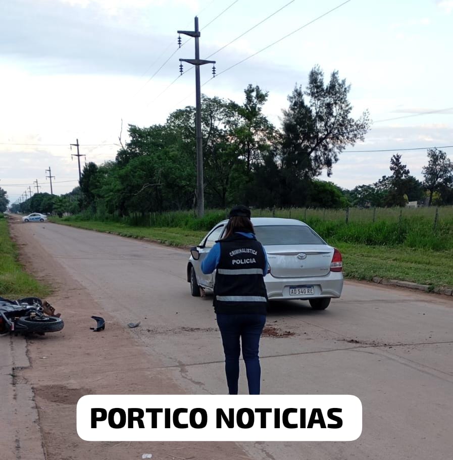 Una motocicleta Honda CB 190cc, sin dominio colocado, colisionó con un automóvil Toyota Etios, dominio AD540RE, conducido por B H C (33 años). El conductor de la motocicleta fue trasladado al hospital local para recibir atención médica.