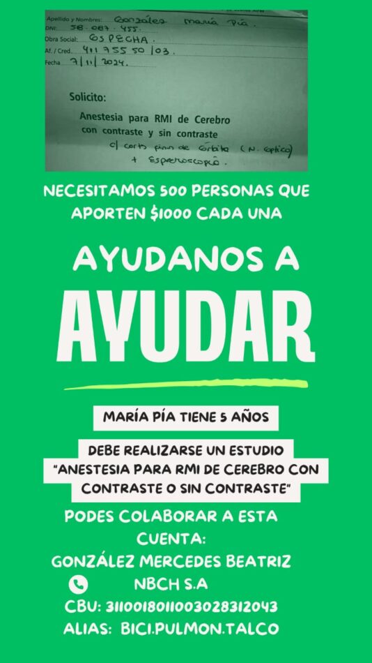 María Pía es una niña de 5 años, de nuestra comunidad en Castelli, que necesita de nuestra ayuda urgente. Para poder acceder a un estudio fundamental para su salud, necesita reunir 500.000 pesos para cubrir el costo de una “Anestesia para RMI de Cerebro con Contraste o Sin Contraste”. Este estudio es crucial para su diagnóstico y tratamiento, y el tiempo es un factor determinante.