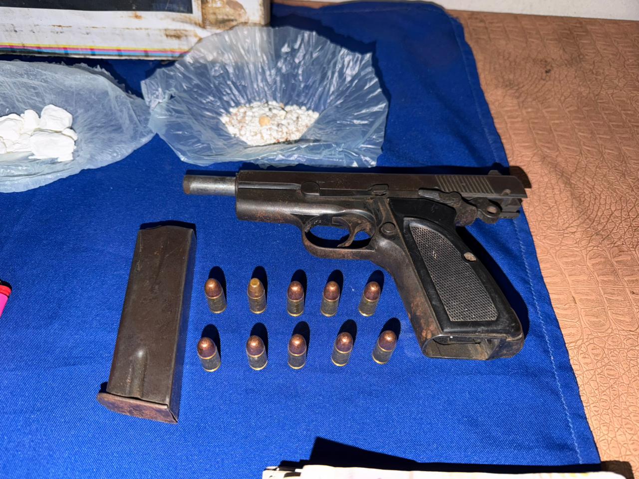 También se encontró en una de las habitaciones una pistola calibre 9 milímetros, con cargador y diez cartuchos del mismo calibre.