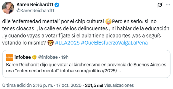 Como era de esperarse, las palabras de Reichardt no demoraron en viralizarse, por lo que la candidata de LLA decidió salir a ¿aclarar?: «Dije ‘enfermedad mental’ por el chip cultural Pero en serio: si no tenés cloacas, la calle es de los delincuentes, ni hablar de la educación, y cuando vayas a votar fíjate si el aula tiene picaportes, ¿vas a seguís votando lo mismo?», reiteró, en relación a la provincia de Buenos Aires.