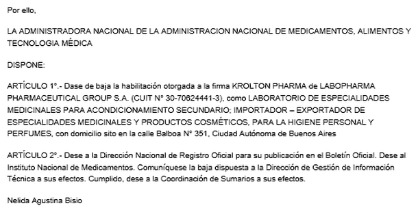 La Administración Nacional de Medicamentos, Alimentos y Tecnología Médica (ANMAT) adoptó una decisión de fuerte impacto en el ámbito farmacéutico al retirar la habilitación sanitaria del laboratorio Krolton Pharma, perteneciente a Labopharma Pharmaceutical Group S.A.