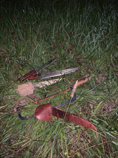 Dos de los sospechosos en una moto derraparon y cayeron, pero siguieron con su huida a pie por los matorrales del lugar donde fueron atrapados. Ellos, ambos de 18 años, tenían tres bolsas arpilleras, una sierra, dos cuchillos y dos vainas, lo que presumía una posible faena.