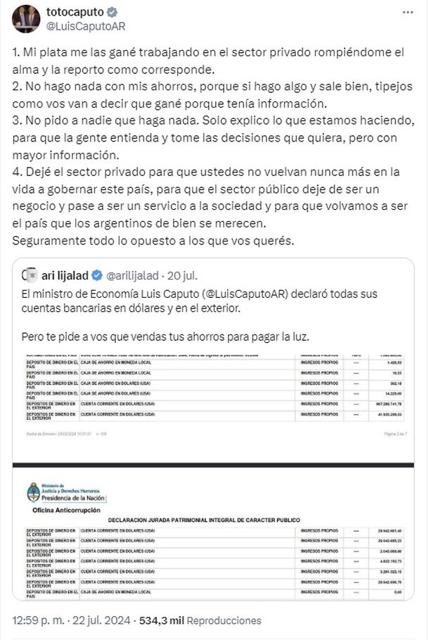 «1) Mi plata me la gané trabajando en el sector privado, rompiéndome el alma y la reporto como corresponde; 2) No hago nada con mis ahorros, porque si hago algo y sale bien, tipejos como vos van a decir que gané porque tenía información», publicó Caputo en respuesta a Lijalad.