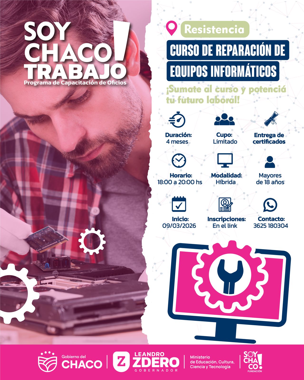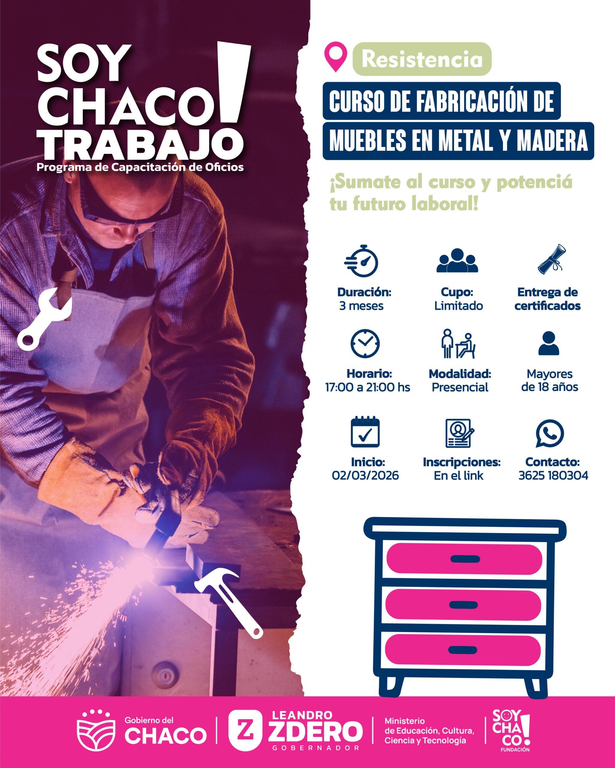 Este martes, la Fundación Soy Chaco anunció la apertura de nuevos cursos de formación en la ciudad de Resistencia. El primero, sobre Fabricación de Muebles en Metal y Madera y el segundo: Reparación de Equipos Informáticos, en el marco del programa Soy Chaco Trabajo.