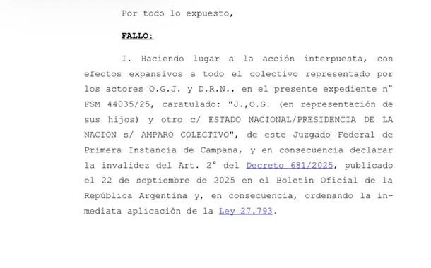 El juez Adrián González Charvay de Campana hizo lugar a un amparo colectivo y además suspendió el artículo del decreto presidencial que obligaba al Congreso a detallar las fuentes de financiamiento.