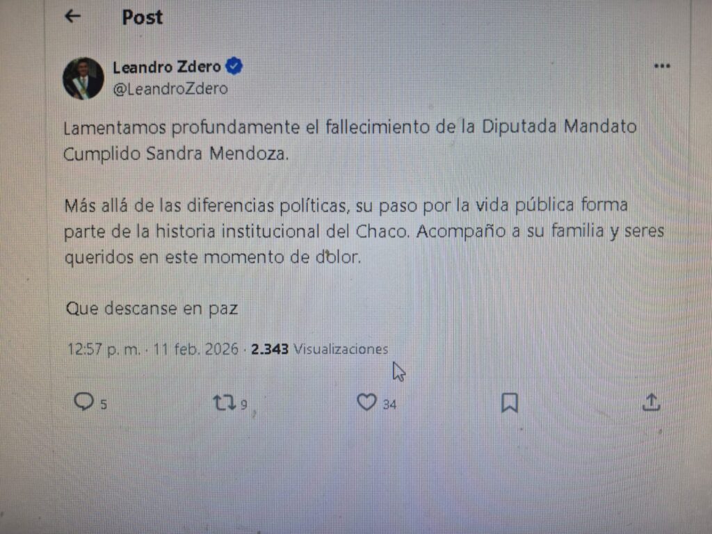 LEANDRO ZDERO GOBERNADOR DEL CHACO EXPRESO SU PESAR POR EL FALLECIMIENTO DE SANDRA MENDOZA DIPUTADA NACIONAL MC