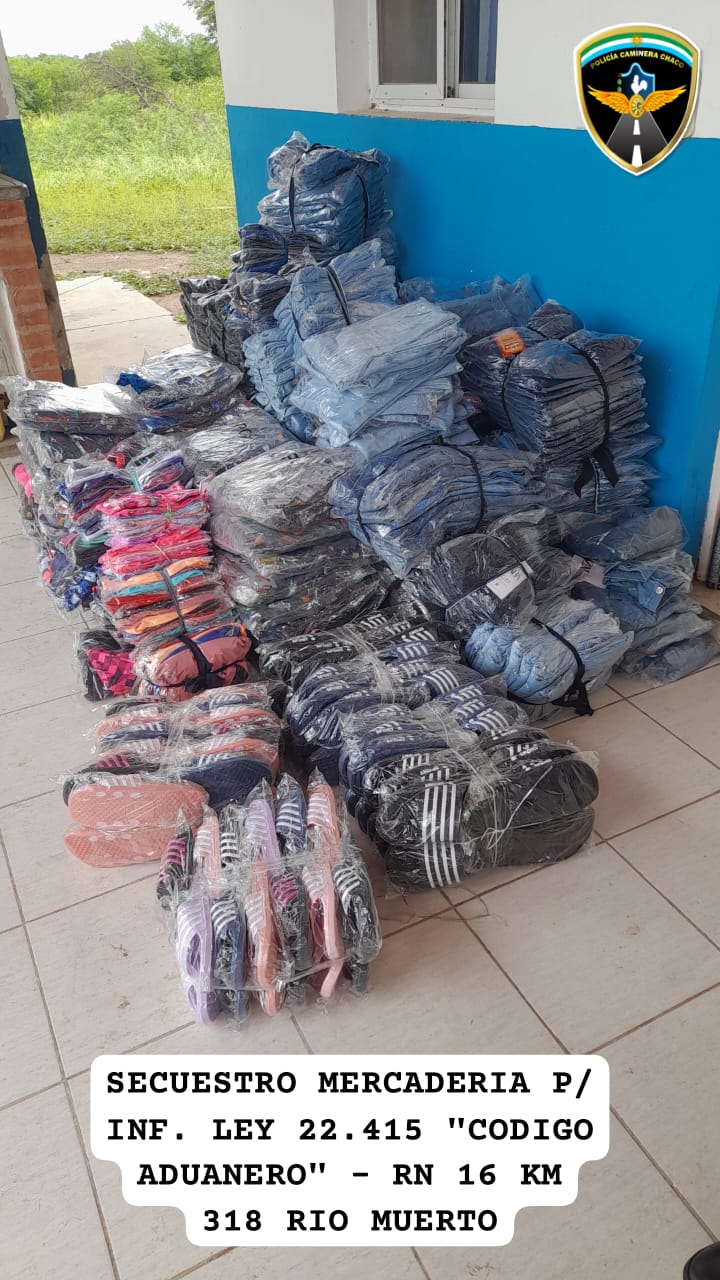 Esta siesta, los agentes de la Patrulla Vial de Charata frenaron el paso de una Toyota Hilux en Ruta 16 al kilómetro 318, cerca de Río Muerto. Al inspeccionar el vehículo, los efectivos descubrieron varios bultos que estaban en la cajuela, estos contenían varias prendas de vestir de origen extranjero.