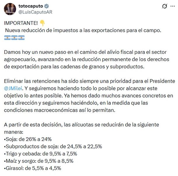 “De esta manera, reafirmamos nuestra convicción de que el campo argentino seguirá creciendo, generando empleo, impulsando el desarrollo en cada región del país y fortaleciendo la presencia de la Argentina en los mercados del mundo”, sostuvo el ministro de Economía en el anuncio que realizó este martes por la mañana a través de una publicación en su perfil oficial de la red social X.