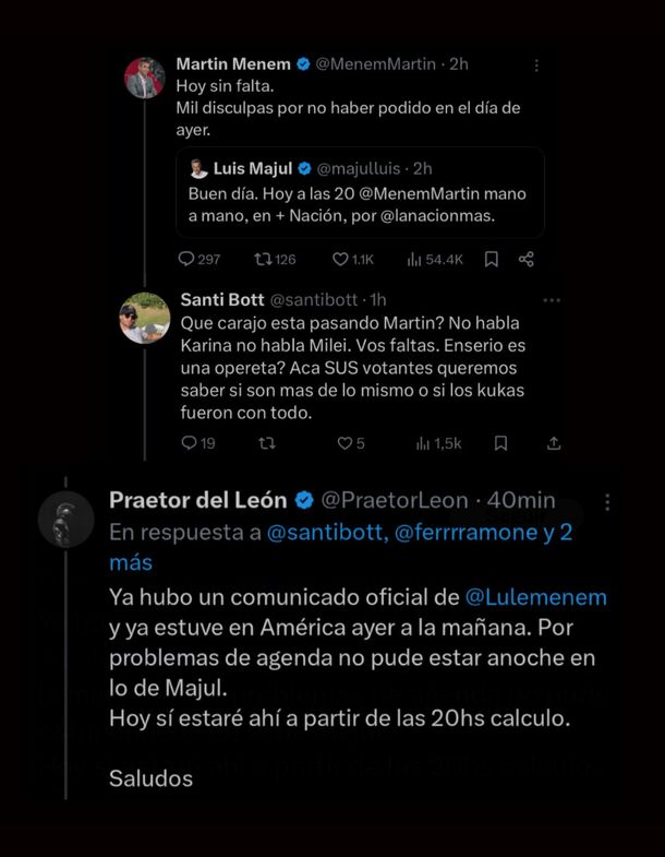 Uno de los posteos más comentados de esa cuenta falsa afirmaba: “Ya hubo un comunicado oficial de Lule Menem y ya estuve en América ayer a la mañana. Por problemas de agenda no pude estar anoche en lo de Majul. Hoy sí estaré ahí a partir de las 20hs calculo. Saludos”. La redacción, el tono y la mención directa a compromisos televisivos le dieron cierta verosimilitud al texto, generando confusión entre los usuarios.