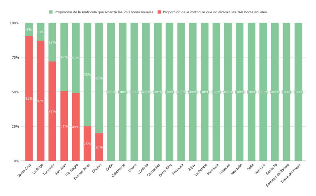 Según este cálculo, 17 jurisdicciones cumplirán en 2026 con el mínimo de horas de clase, mientras que hay 7 provincias donde una proporción significativa de los estudiantes no alcanzarán las 760 horas mínimas fijadas por el CFE para primaria. En Santa Cruz (91%), La Rioja (87%) y Tucumán (72%), más del 70% de los alumnos queda por debajo del piso. Las otras cuatro provincias que no alcanzan la meta son San Juan (51%), Río Negro (49%), Buenos Aires (25%) y Chubut (20%). El cálculo contempla la cantidad de días de clase, ​ la duración diaria de la jornada simple en cada provincia (que puede variar entre 4 y 5 horas) y la proporción de alumnos que asisten a jornada simple según el Relevamiento Anual 2024 (último dato disponible) y consultas a las jurisdicciones.