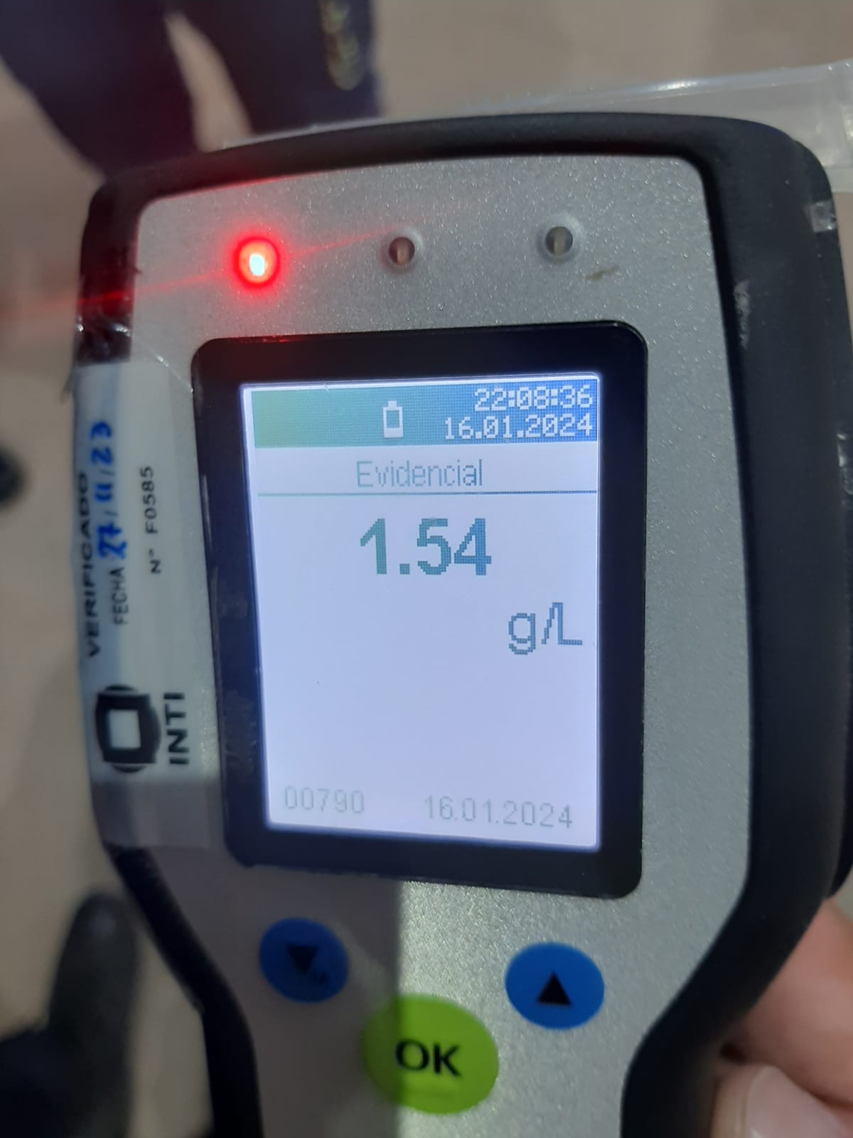 Se procedió a interceptar (1) automóvil marca Chevrolet Corsa, color gris, con cinco ocupantes, quienes se hallaban ingiriendo sustancias alcohólicas, por lo que se realizó test de alcoholemia a su conductor arrojando resultado 1,54° de alcohol en sangre. Asimismo, se constató existencia de un envoltorio con ínfima cantidad de estupefaciente por lo que personal idóneo de Div. Op. Drogas procedió a realizar prueba de campo arrojando resultado positivo a cannabis sativo, notificando al propietario del envoltorio Sup. infracción Ley 23.737, en concordancia con ley 2.304-N.