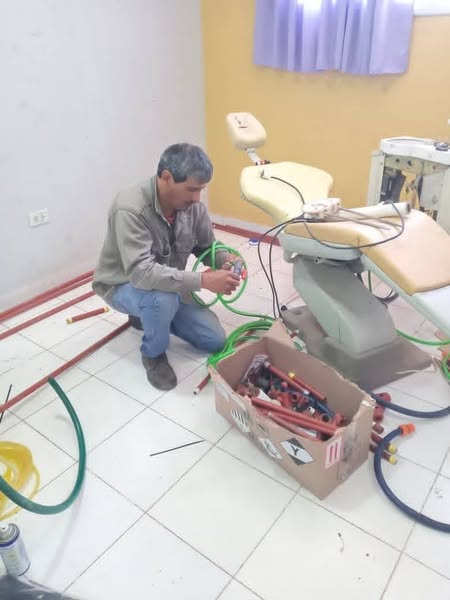 – Personal de la Municipalidad de Miraflores junto a técnicos de la Fundación «Cuerpo y Alma» trabaja en la instalación de sillones odontológicos en el polideportivo municipal. Desde el pasado sábado y hasta el momento se viene instalando 7 sillones.