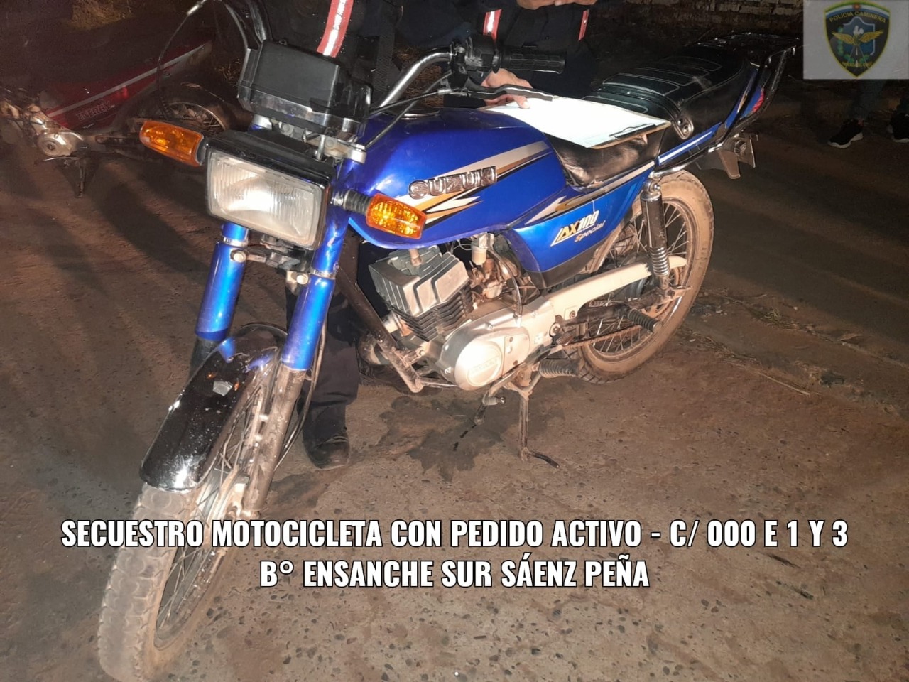 Asimismo, recuperaron una motocicleta marca Suzuki, AX 100 cc, azul, con pedido de secuestro por supuesto hurto del 2021, a solicitud Cria 3ra Sáenz Peña.