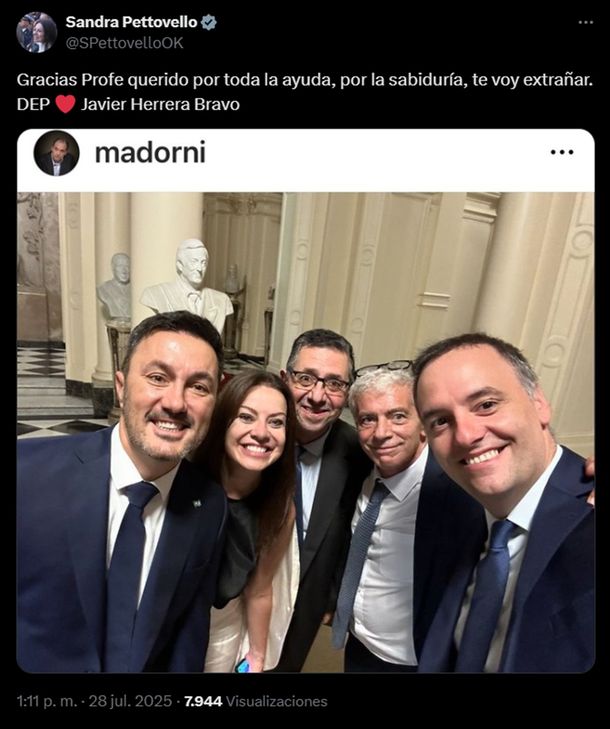 La ministra de Capital Humano, Sandra Pettovello, fue una de las funcionarias que se hizo eco de la noticia: «Gracias, Profe querido, por toda la ayuda, por la sabiduría. Te voy a extrañar. DEP Javier Herrera Bravo», escribió.