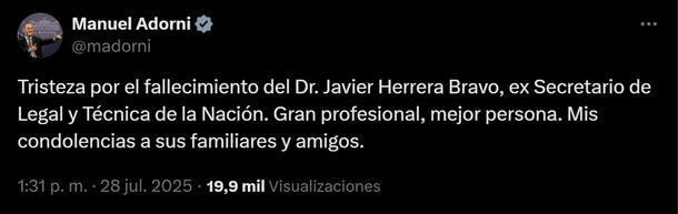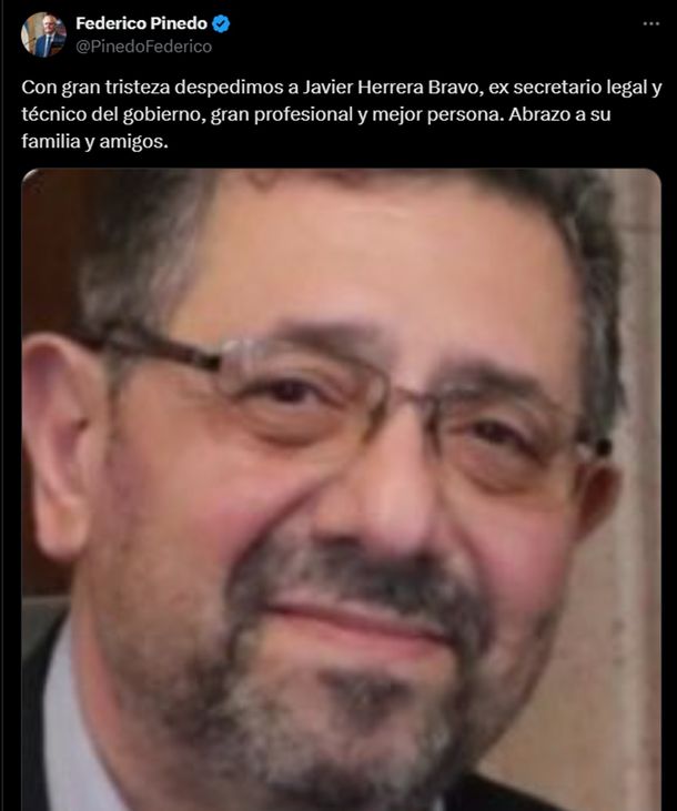 También se sumó a las despedidas el exsenador Federico Pinedo: «Con gran tristeza despedimos a Javier Herrera Bravo, exsecretario Legal y Técnico del gobierno, gran profesional y mejor persona. Abrazo a su familia y amigos».