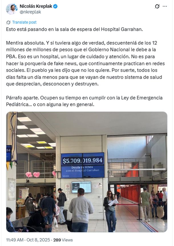 «Por suerte, todos los días falta un día menos para que se vayan de nuestro sistema de salud que desprecian, desconocen y destruyen», expresó el funcionario de Axel Kicillof, y sentenció: «Párrafo aparte. Ocupen su tiempo en cumplir con la Ley de Emergencia Pediátrica… o con alguna ley en general.»