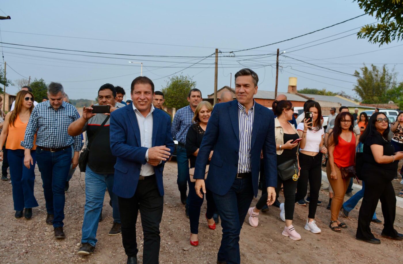 El gobernador Leandro Zdero junto al intendente de Presidencia Roca, Gustavo Martinez, dejó inaugurado, este domingo, cuadras de enripiado y cordón cuneta en el Barrio San Juan de la localidad.