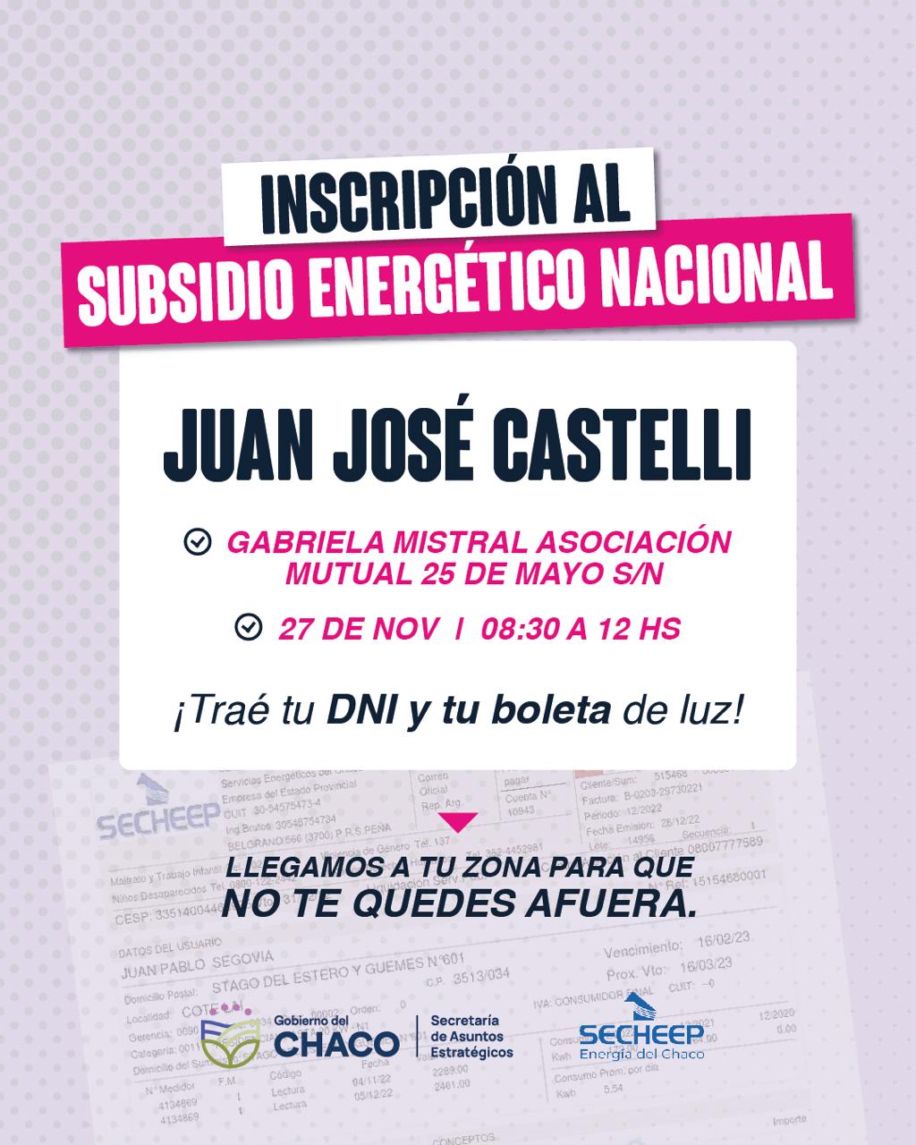 OPERATIVO DE INSCRIPCIÓN AL SUBSIDIO ENERGÉTICO NACIONAL LLEGA A JUAN JOSÉ CASTELLI