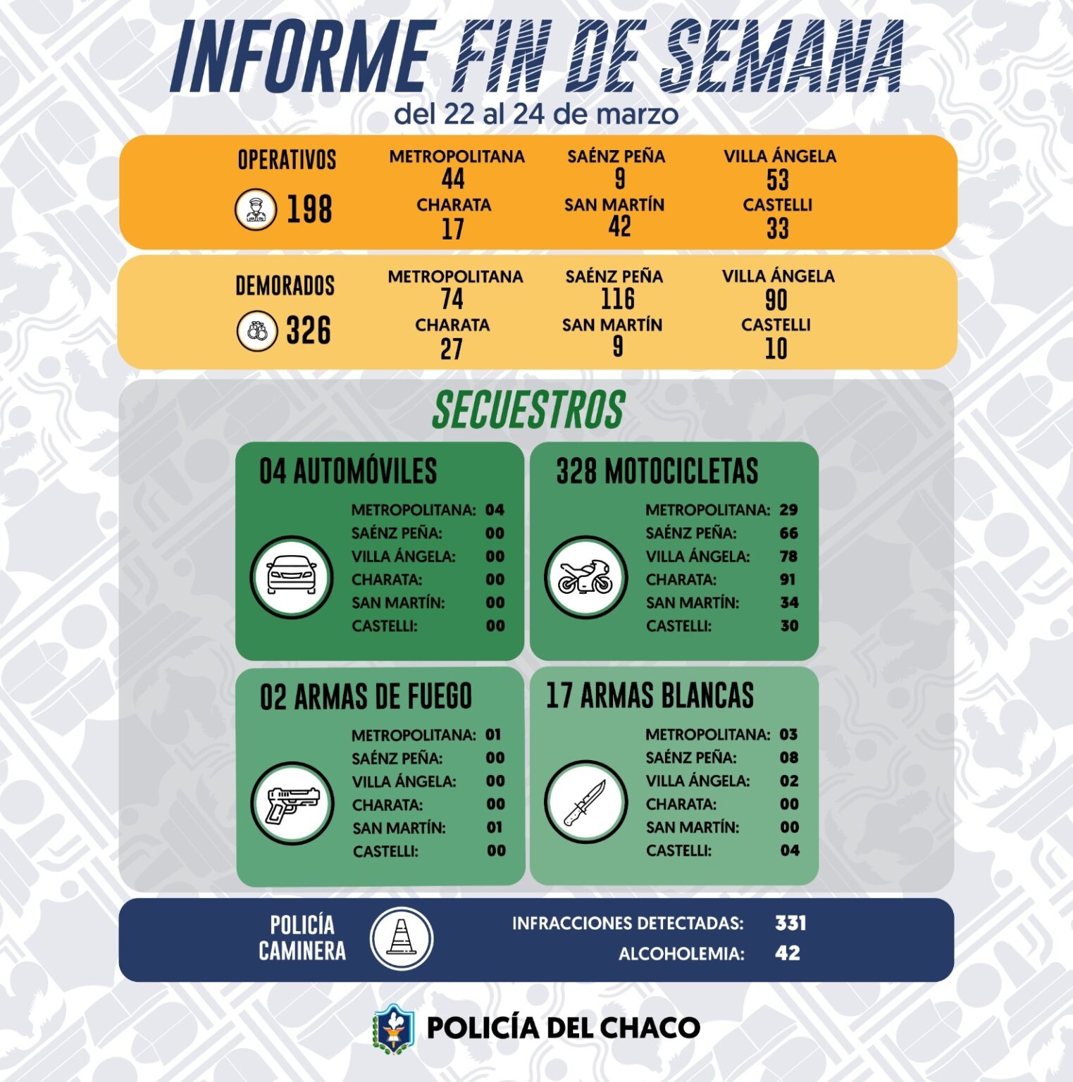 Este fin de semana se realizaron 198 operativos policiales en toda la provincia. Entre el viernes y el domingo, unas 326 personas resultaron demoradas por distintas infracciones a la ley.