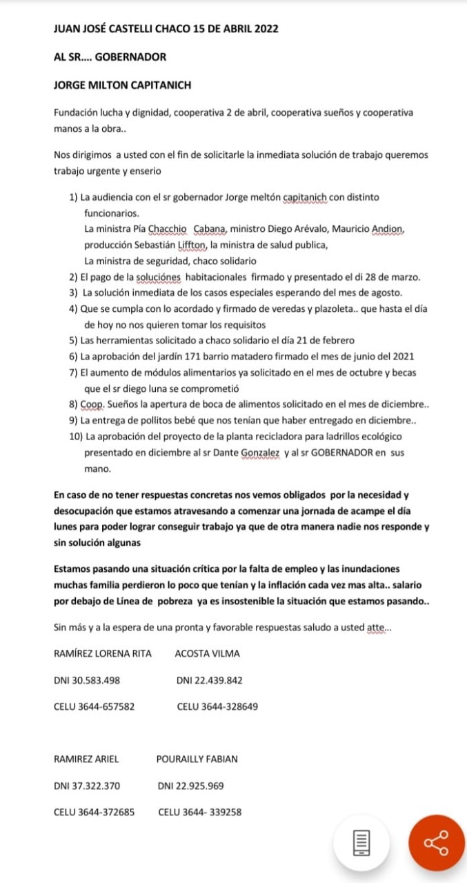 El pago de la soluciones habitacionales firmado y presentado el di 28 de marzo. La solución inmediata de los casos especiales , Que se cumpla con lo acordado y firmado de veredas y plazoleta, herramientas , La aprobación del jardín 171 barrio matadero ,aumento de módulos alimentarios , Coop. Sueños la apertura de boca de alimentos , entrega de pollitos bebé , aprobación del proyecto de la planta recicladora para ladrillos ecológico .