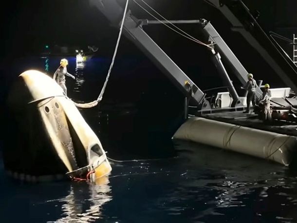 Después de aterrizar exactamente a la hora prevista y de realizar lo que según la NASA fue «una reentrada perfecta», la tripulación permaneció en la cápsula, que fue recuperada y trasladada a un buque por los miembros del equipo de recuperación, donde a los astronautas se les hará un examen médico inicial antes de ser trasladados a tierra en helicóptero.