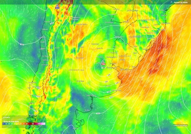 A las lluvias se sumará el viento, con intensidades de 20 a 40 km/h y ráfagas de 50 a 75 km/h, especialmente cerca del centro de la baja presión.