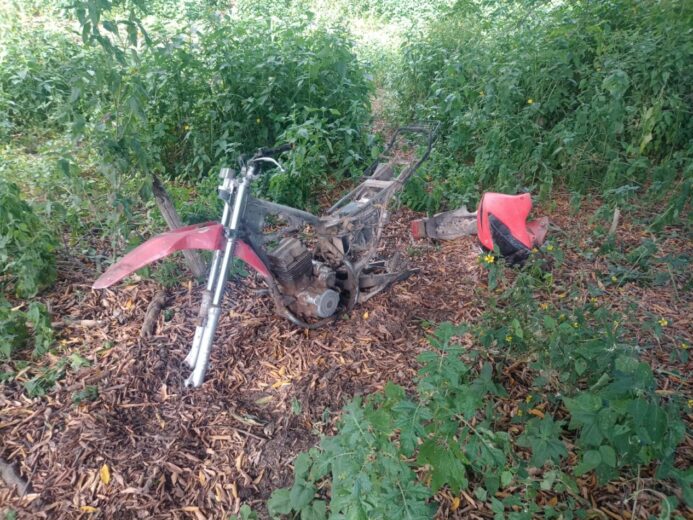 En horas del mediodía, un ciudadano de 62 años domiciliado en el Paraje Las 5 Bocas denunció la sustracción de su motocicleta marca Appia, modelo stronger de 150 cilindradas la cual se encontraba estacionada en el patio delantero de su morada. Mediante ello, los efectivos procedieron a realizar la búsqueda del rodado que en horas de la tarde lograron hallarla en una zona boscosa a escasos metros del lugar del hecho. La misma estaba desarmada casi en su totalidad.